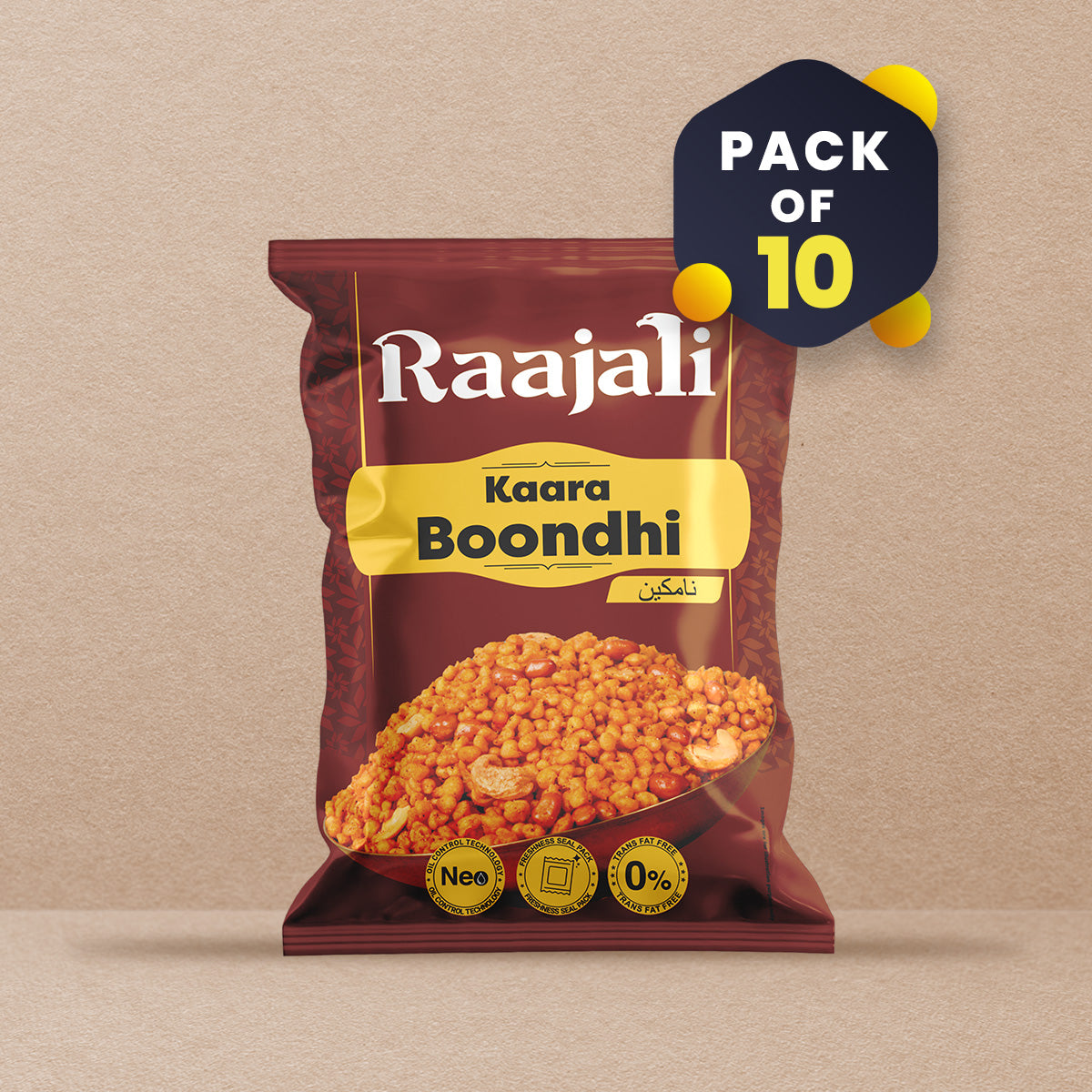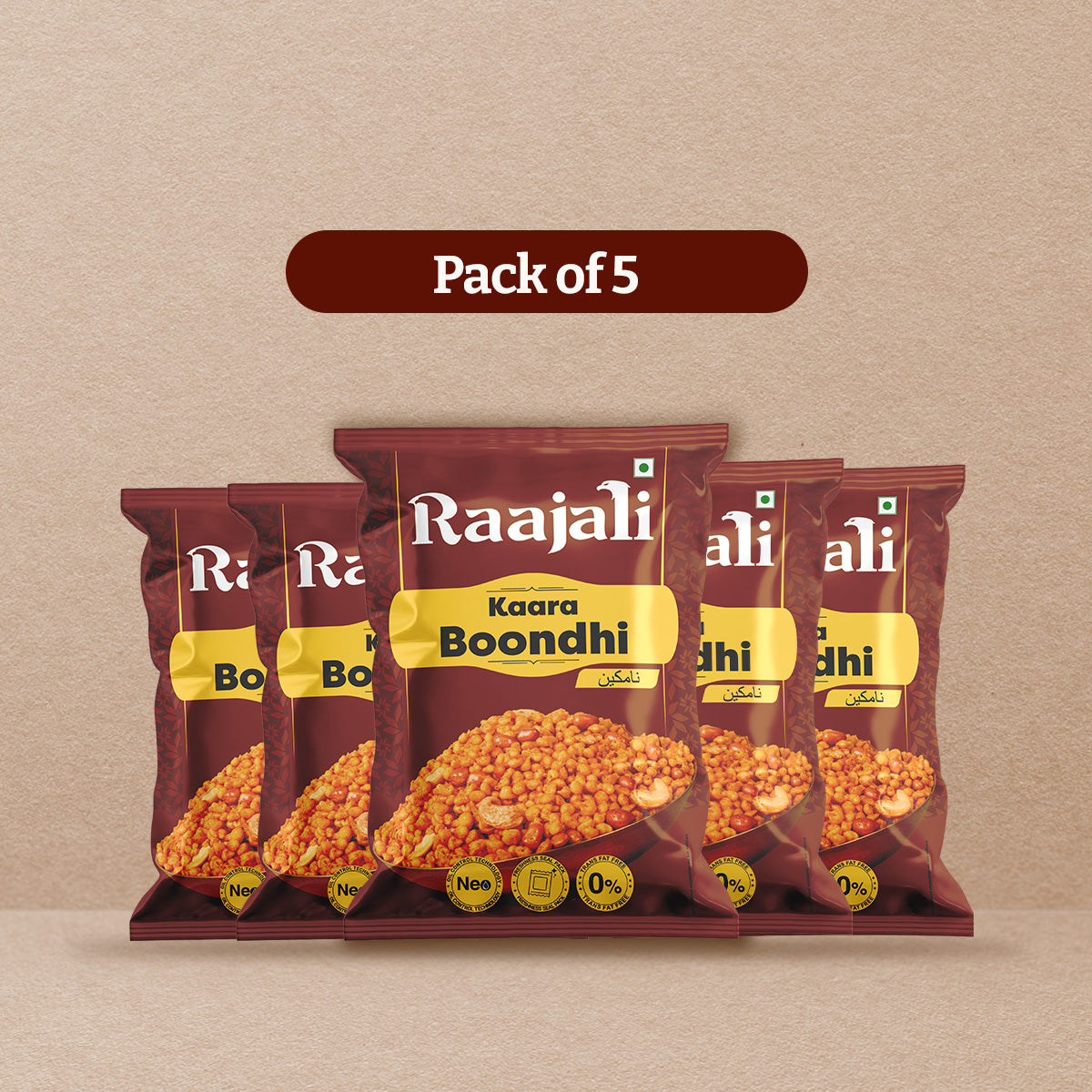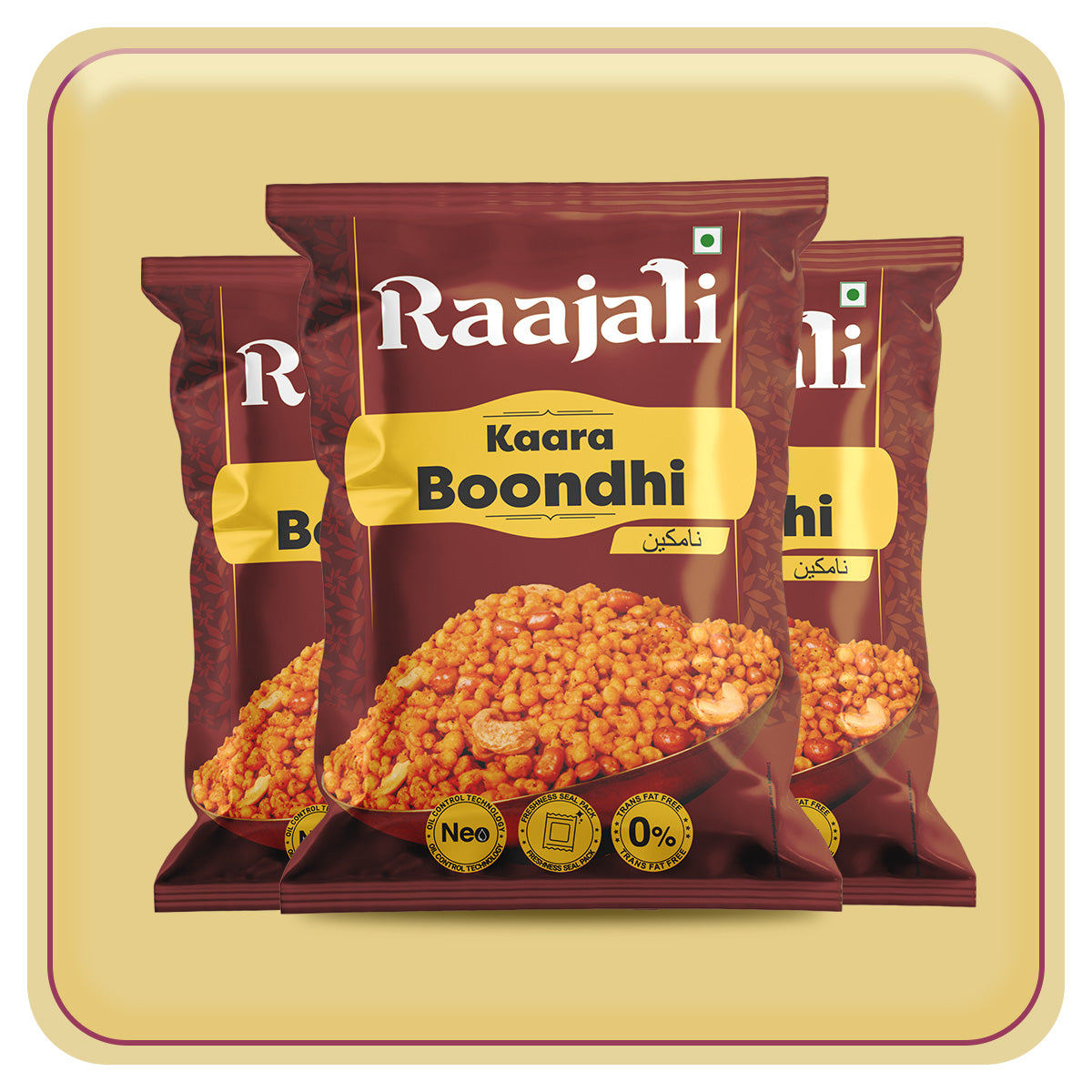 Dive into the spicy, crunchy world of Raajali's Kaara Boondhi, where each 140g pack is a treasure trove of flavor.