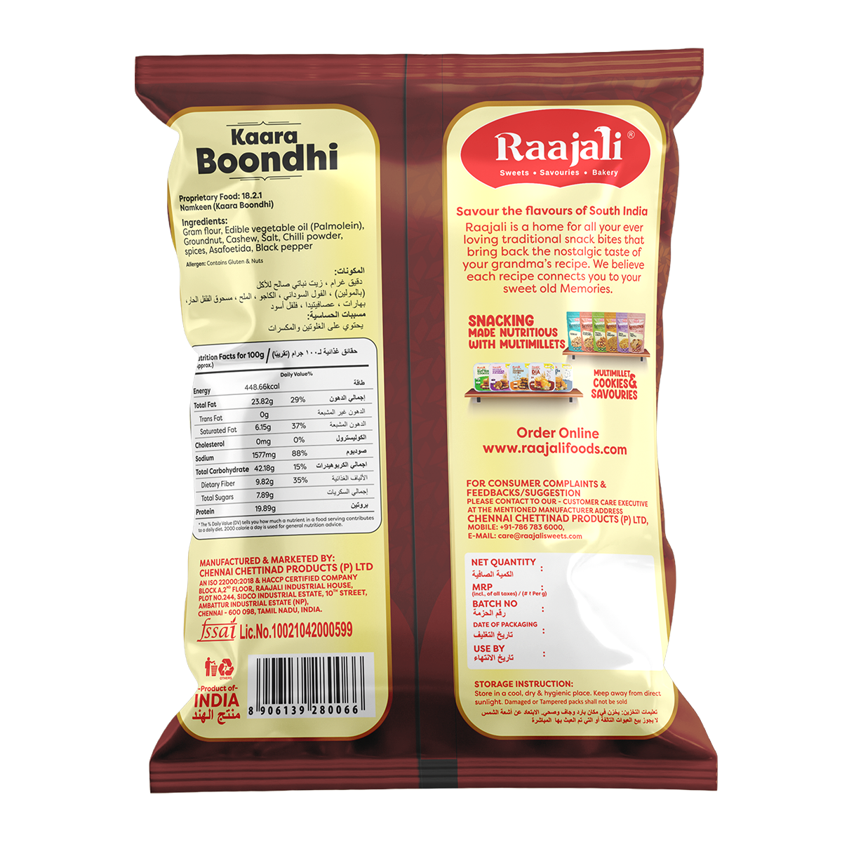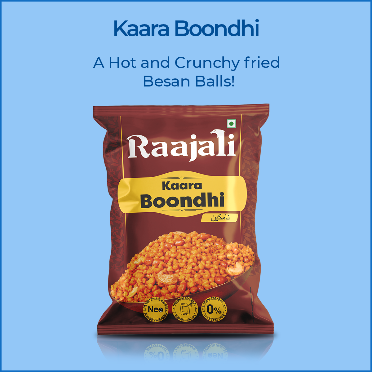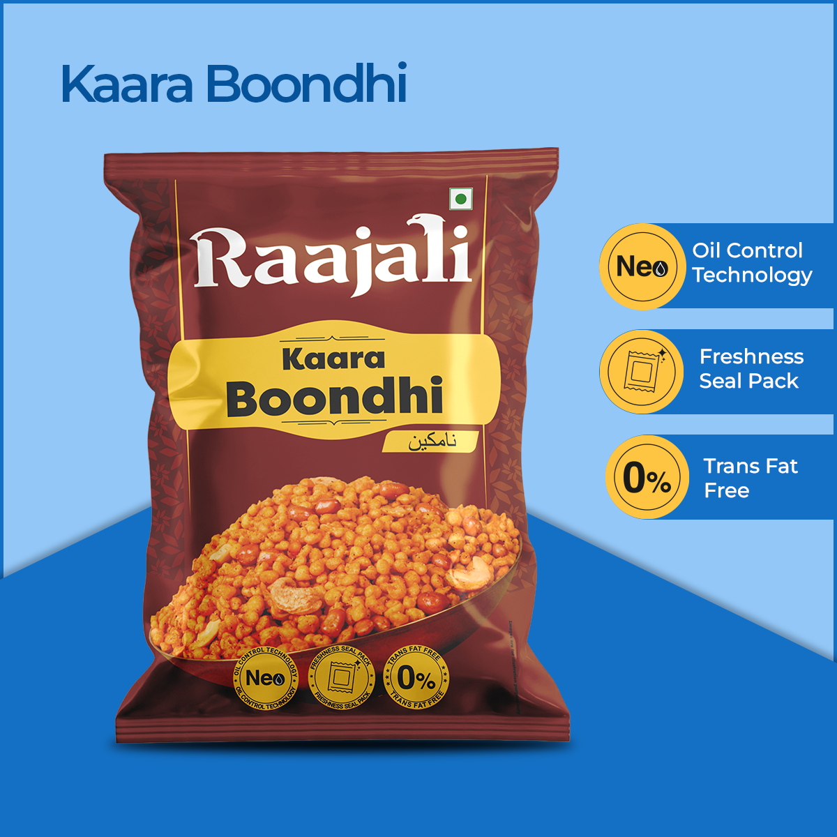 Dive into the spicy, crunchy world of Raajali's Kaara Boondhi, where each 140g pack is a treasure trove of flavor.